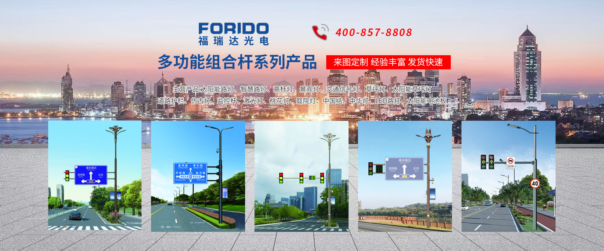 揚(yáng)州福瑞達(dá)光電科技有限公司位于淮左名都?xì)v史文化名城、中國(guó)路燈制造基地?fù)P州市北郊菱塘工業(yè)園,公司占地面積76000平方米,注冊(cè)資金10518萬(wàn)元,擁有高級(jí)技術(shù)嫻熟的員工280多人,擁有大型折彎?rùn)C(jī)、激光切割、數(shù)控注塑機(jī)、壓鑄機(jī)、自動(dòng)埋弧焊、氣焊、彩色粉末靜電噴塑等大型自動(dòng)化設(shè)備,我公司是一家集設(shè)計(jì)、研發(fā)、生產(chǎn)、銷售、施工安裝服務(wù)為一體的戶外交通照明產(chǎn)品制造商,主要生產(chǎn)智慧路燈、太陽(yáng)能路燈、LED路燈、高桿燈、景觀燈、交通信號(hào)燈、交通標(biāo)志牌、通信鐵塔、路跨鋼結(jié)構(gòu)、公交站臺(tái)、太陽(yáng)能光伏組件、景點(diǎn)亮化、樓宇亮化工程的設(shè)計(jì)施工等。公司秉承開(kāi)拓創(chuàng)新、銳意進(jìn)取、精誠(chéng)服務(wù)的企業(yè)精神,堅(jiān)持以“誠(chéng)信為本、技術(shù)為先、服務(wù)是金”的合作理念,我們憑借先進(jìn)的制造工藝、優(yōu)質(zhì)的產(chǎn)品質(zhì)量、合理的市場(chǎng)價(jià)格和完善的售后服務(wù)贏得了廣闊的市場(chǎng)和客戶的信賴。 我公司已通過(guò)ISO9001質(zhì)量體系認(rèn)證、ISO14001環(huán)境管理體認(rèn)證,CQC產(chǎn)品認(rèn)證,中國(guó)節(jié)能產(chǎn)品認(rèn)證,通過(guò)“CCC”強(qiáng)制性產(chǎn)品認(rèn)證,具有市政總承包,照明,交安,設(shè)計(jì)等資質(zhì)···